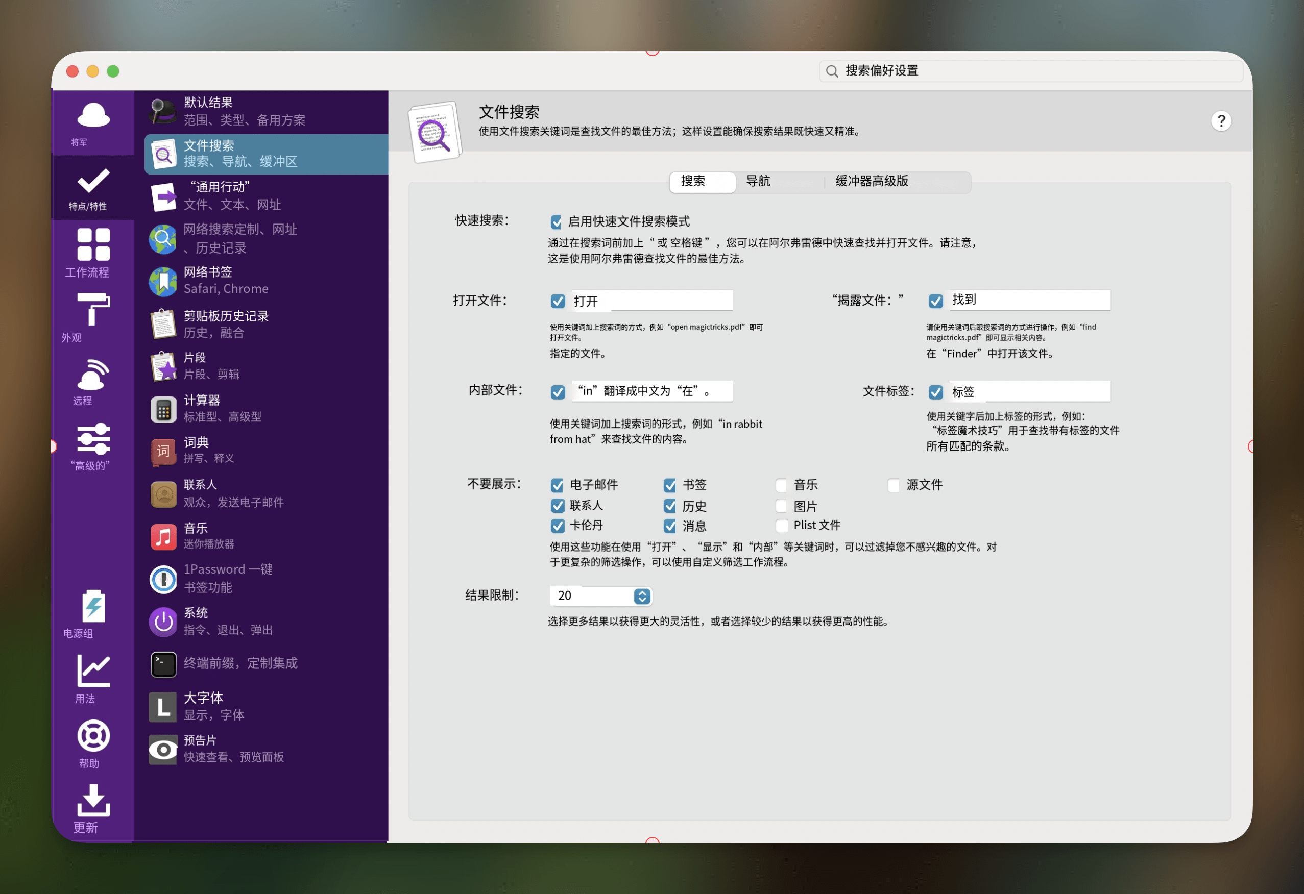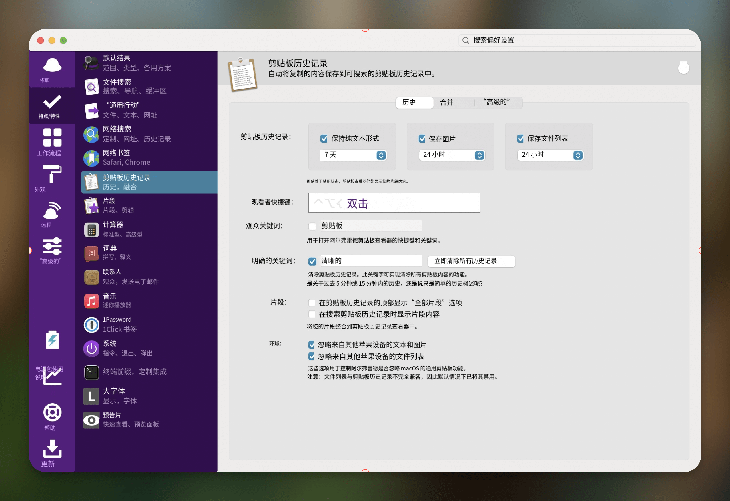 • Workflows (工作流): Alfred 的核心竞争力。用户可以像搭积木一样创建或从 Alfred Gallery 下载自动化脚本,例如一键查询翻译、查汇率、控制 Spotify、甚至整合 ChatGPT 等 AI 工具。