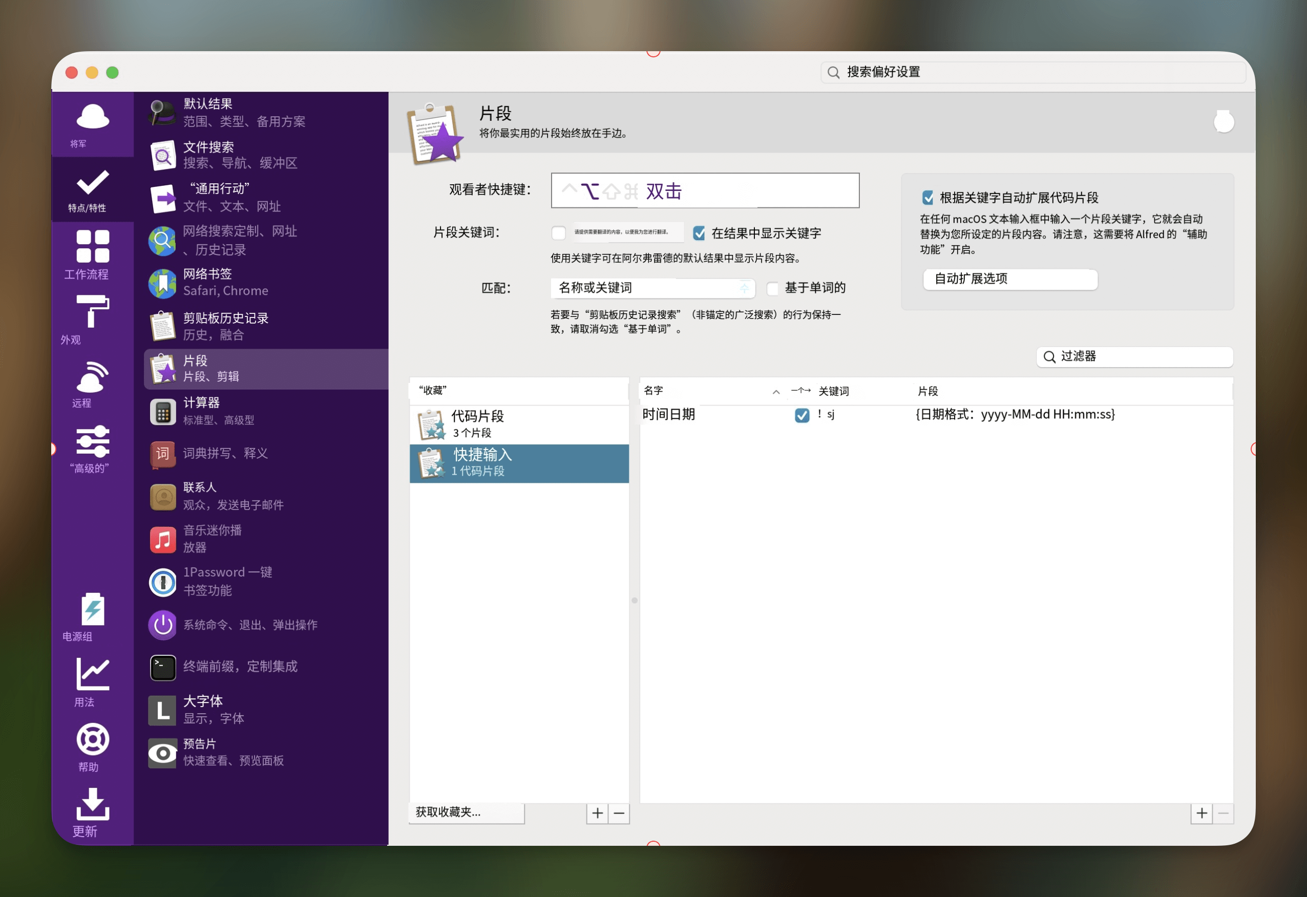 Alfred 是一款专为 macOS 设计的顶级效率启动器(Launcher),常被苹果用户称为“Mac 必备效率神器”。它通过快捷键、关键词、文本扩展等功能提升您的工作效率。您可以搜索 Mac 和网络,并通过自定义操作来控制 Mac,从而提高工作效率。